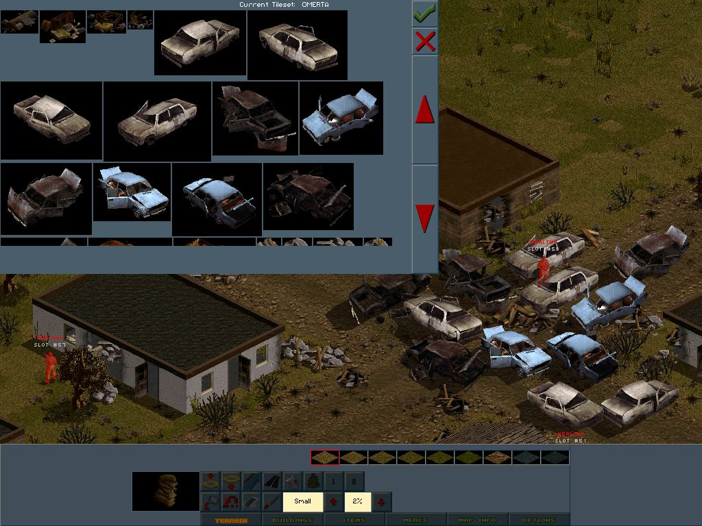 Skoro masz wraki samochodów, no to najlepszą metodą będzie dodanie ich do aktualnego zbioru wraków samochodu. Znajdują się one m.in. w 9 folderze w tilesetach, w pliku DAMCAR.STI. Jedyne co musisz zrobić to otworzyć ten plik i pododawać do niego wszystkie swoje wraki.