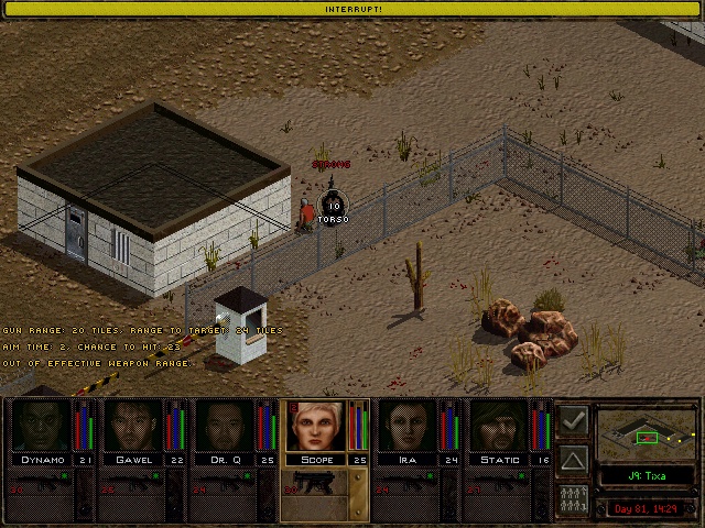 Mianowice, jako, że próbowałem już JA2 1.13 i mi nie spasował zbyt duży zakres zmian w grze, to wróciłem do starego poczciwego JA2 1.12 Gold. Pogrzebałem w plikach źrółowych i udało mi się stworzyć małą modyfikację, dzięki której za pomocą klawisza F wyświetla się szansa na trafienie z trzymanej broni.