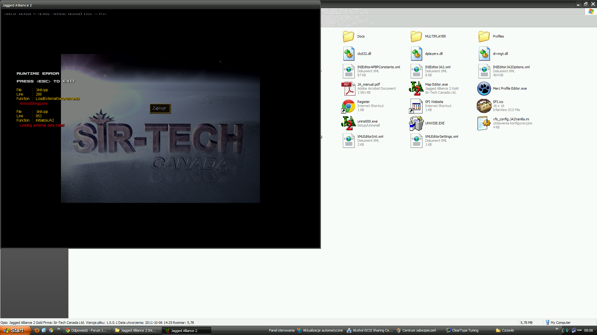 Ta linia wskazuje na błąd w pliku exe i gra nie może otworzyć pliku AmmoStrings.xml. Możliwe, że brakuje Polish.AmmoStrings.xml.